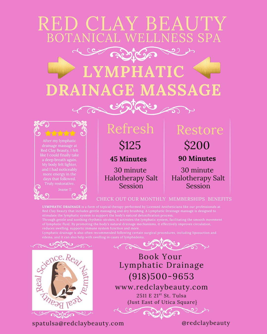 At Red Clay Beauty, lymphatic drainage isn’t just a technique—it’s a necessity to overall wellness. Our approach blends intuitive touch, botanical oils, and holistic intention to create a deeply therapeutic experience.